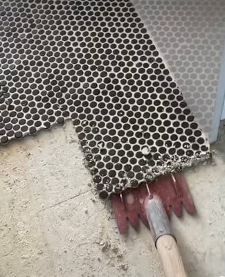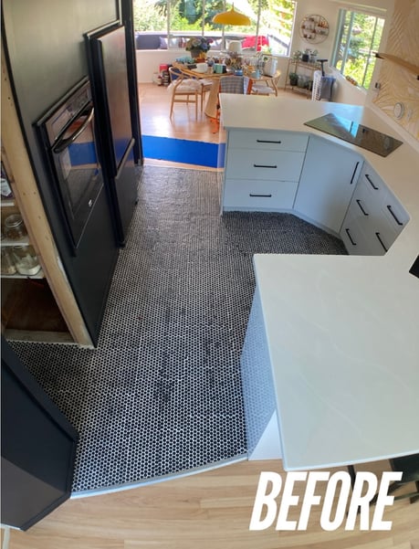 The fully stocked refrigerator is easily moved without scratching the flooring using the AirGlide Moving Systems dolly - a great innovation that utilizes hovercraft principles to move heavy objects on a cushion of air. After the appliances are removed, the tiles were stripped from the OSB (oriented strand board) underlayment. Surprisingly, the penny-round mosaics came out easily with a roofer's spade - they were barely bonded.
