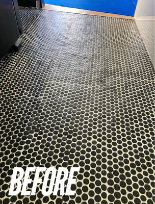 Sadly, this black porcelain penny-round tile installation failed. The homeowners lived with it for a while before finding the perfect replacement; 3" polished porcelain hexagon tiles that brilliantly emulate Nero Marquina marble.