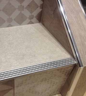 Tile edge trim is a metal moulding that is used to finish a tile edge, where the tile finish terminates or at outside corners of a tile installation. Typically made of aluminum, and available in various finishes, colours and profile designs, they are anchored into the mortar by a thin flange that is positioned under the tile. A slight gap is left between the trim and the tile that is filled during the grouting process. It becomes an integral part of the design - in both looks and function - it protects the edge and can either blend in with the tile finish or accentuate the transition... in a chrome finish, for instance.